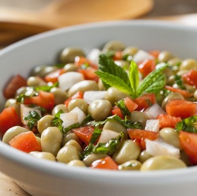 Junge Saubohnen, Salzkartoffeln, geröstete Auberginen, geröstete Zwiebeln, Blätterteig auf dem Grill, Öl, Essig, Salz, frisch gemahlener schwarzer Pfeffer, gemahlener Kreuzkümmel.