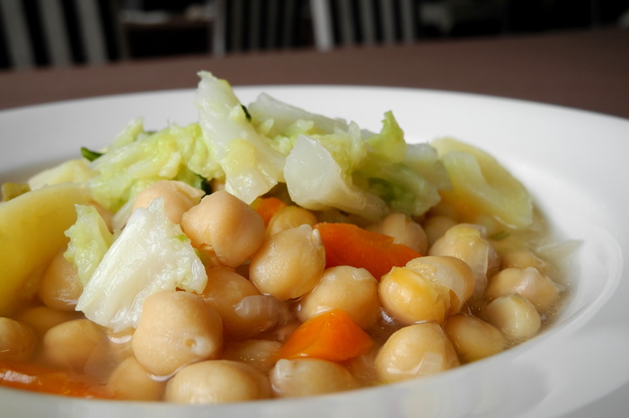 Der Schnittlauch wird in dünne Julienne-Streifen geschnitten und in Olivenöl gebraten; Wenn es gut gebraten ist, fügen Sie die zerkleinerten Kichererbsen hinzu und braten Sie sie an, bis eine glatte Creme entsteht. Es ist gewürzt und reserviert. Für den Kichererbsenpfannkuchen werden Brot vom Vortag, ein Glas Sherry oder trockener Wein, Eier, natives Olivenöl, gekochte Kichererbsen, ein Spritzer Mandelmilch, Salz und Petersilie verwendet.