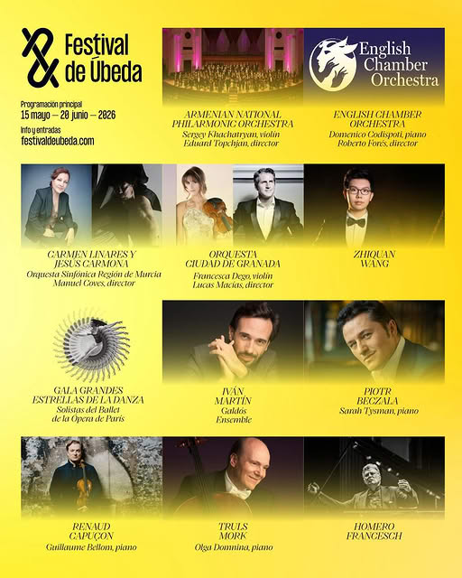 El Festival Internacional de Música y Danza “Ciudad de Úbeda” 2026 celebra del 15 de mayo al 20 de junio su 38ª edición y vuelve a situar a la ciudad Patrimonio de la Humanidad como uno de los grandes epicentros culturales de España, con una programación de primer nivel que reúne a orquestas, solistas y compañías de danza de prestigio internacional