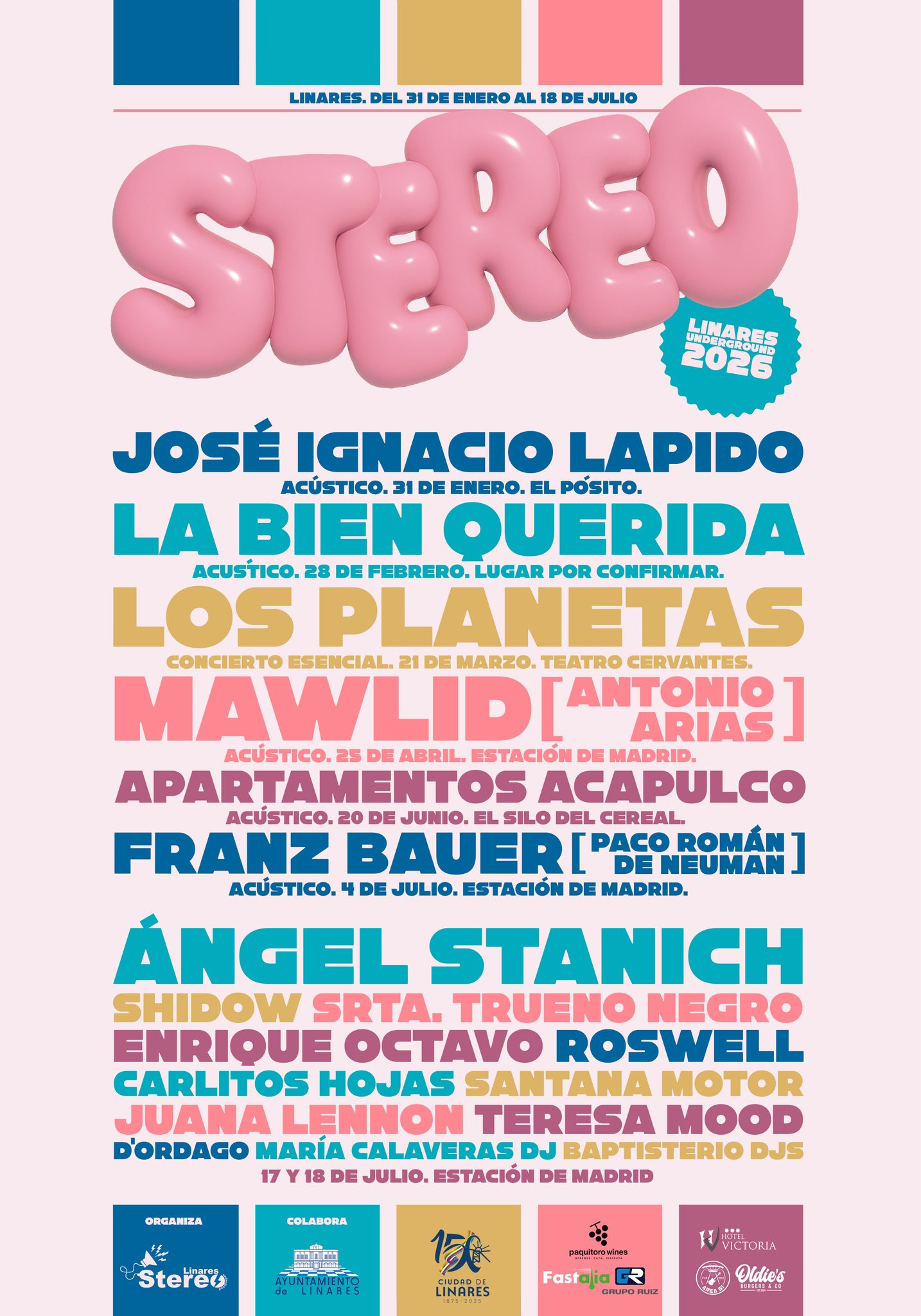 Del 31 de enero al 18 de julio de 2026 Linares acoge el festival ‘Stereo Linares Underground 2026’, con diferentes actuaciones musicales en diferentes enclaves de la ciudad. El certamen dará cabida grupos emergentes y consolidados, y por supuesto artistas locales. Por los diferentes escenarios de Stero pasarán, entre otros, José Ignacio Lapido, La Bien Querida, Los Planetas, Ángel Stanich, Carlitos Hojas, D’Órdago o María Calaveras.