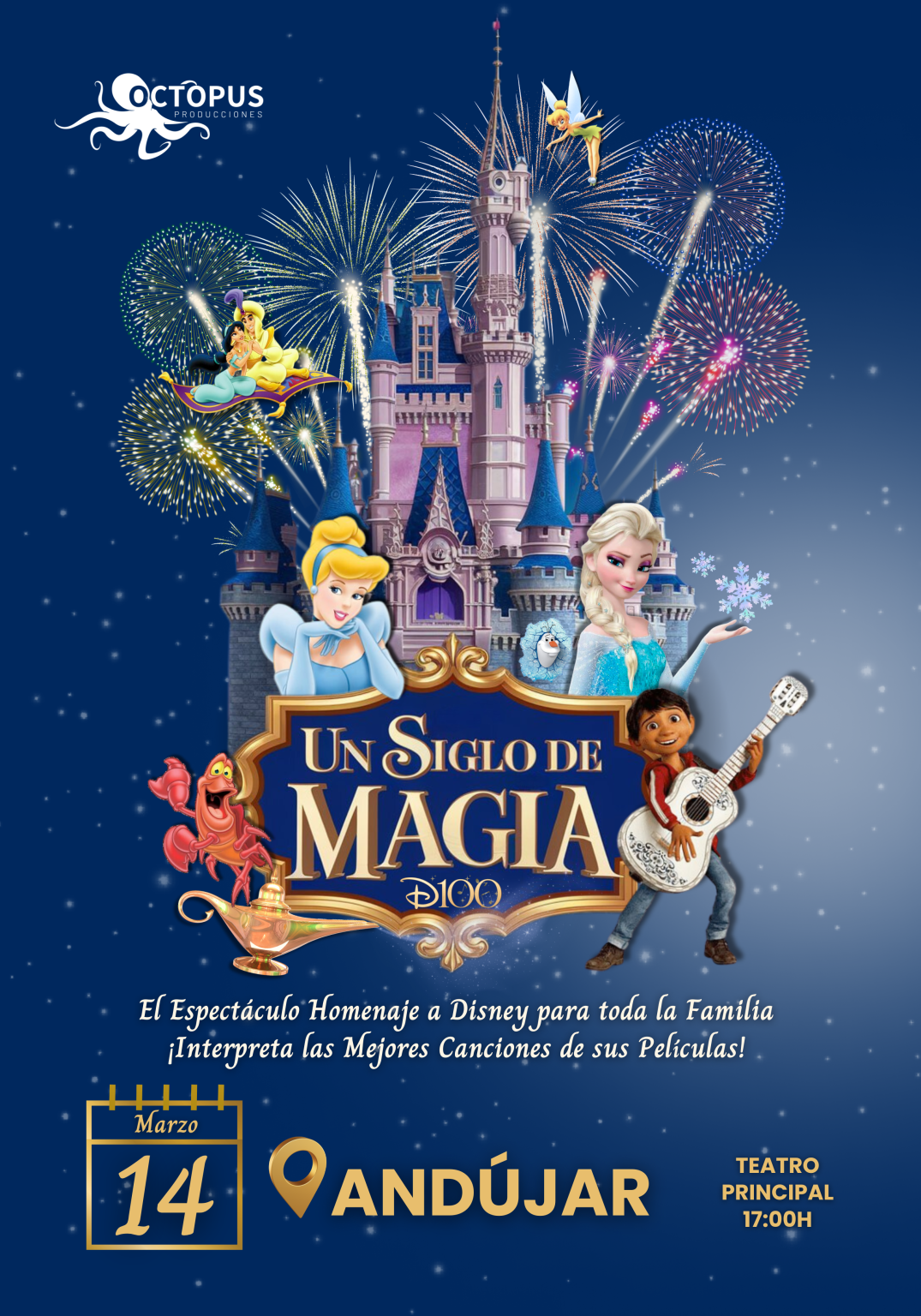 El 14 de marzo, el Teatro Principal de Andújar nos propone realizar un viaje mágico a través del tiempo con «Un Siglo de Magia», un espectacular homenaje musical que celebra los 100 años de la magia de Disney. Este deslumbrante espectáculo reúne a toda la familia en una experiencia única, llena de emociones, nostalgia y encanto.