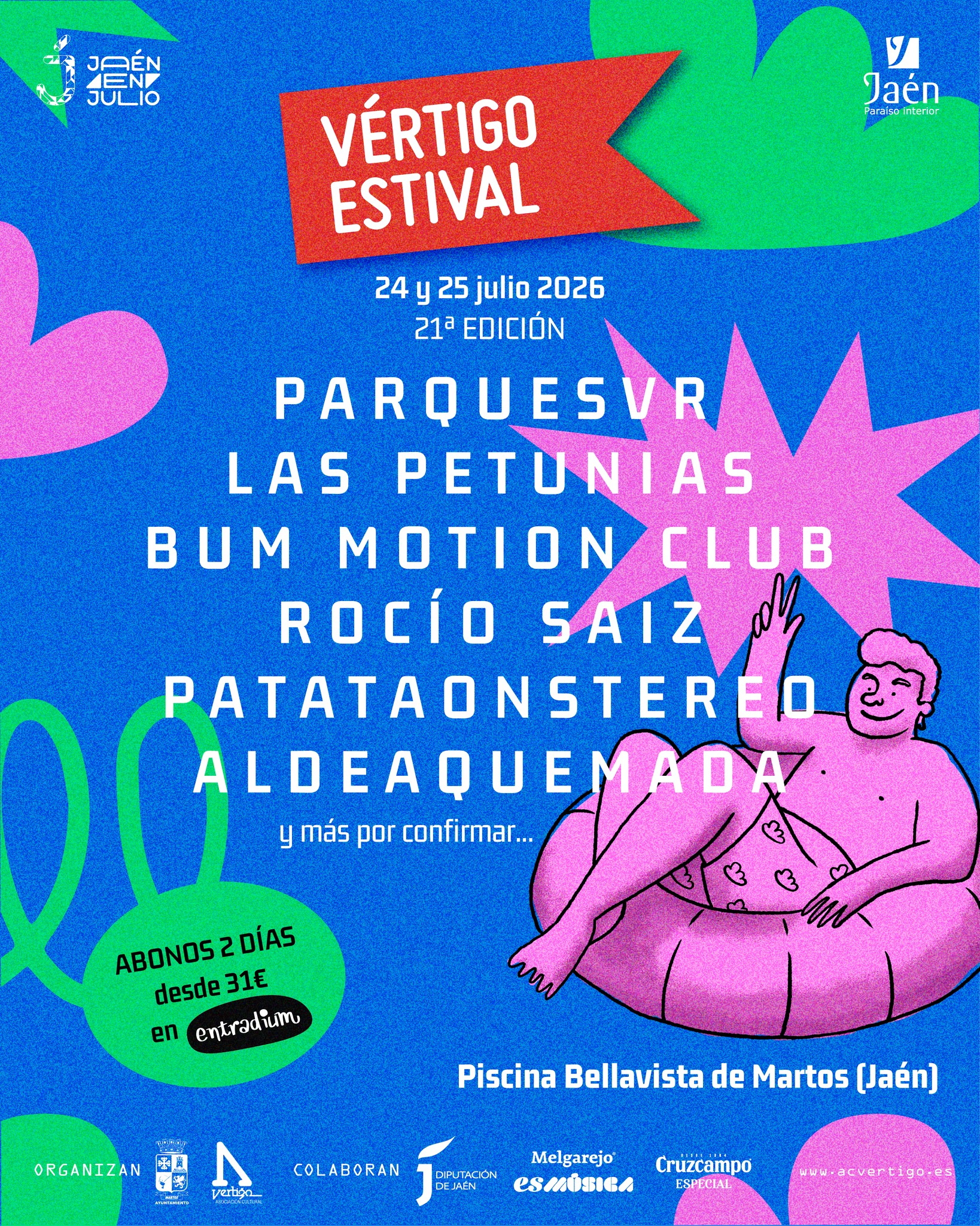 En pleno corazón del verano, cuando Martos se enciende de luz y las tardes se alargan sobre la campiña, vuelve uno de los encuentros más queridos de Jaén en Julio: Vértigo Estival, que celebra su 21ª edición. Dos días —24 y 25 de julio— para sumergirse en un festival diferente, cercano, luminoso, que convierte la Piscina Bellavista en un pequeño oasis musical donde el calor se lleva bailando.