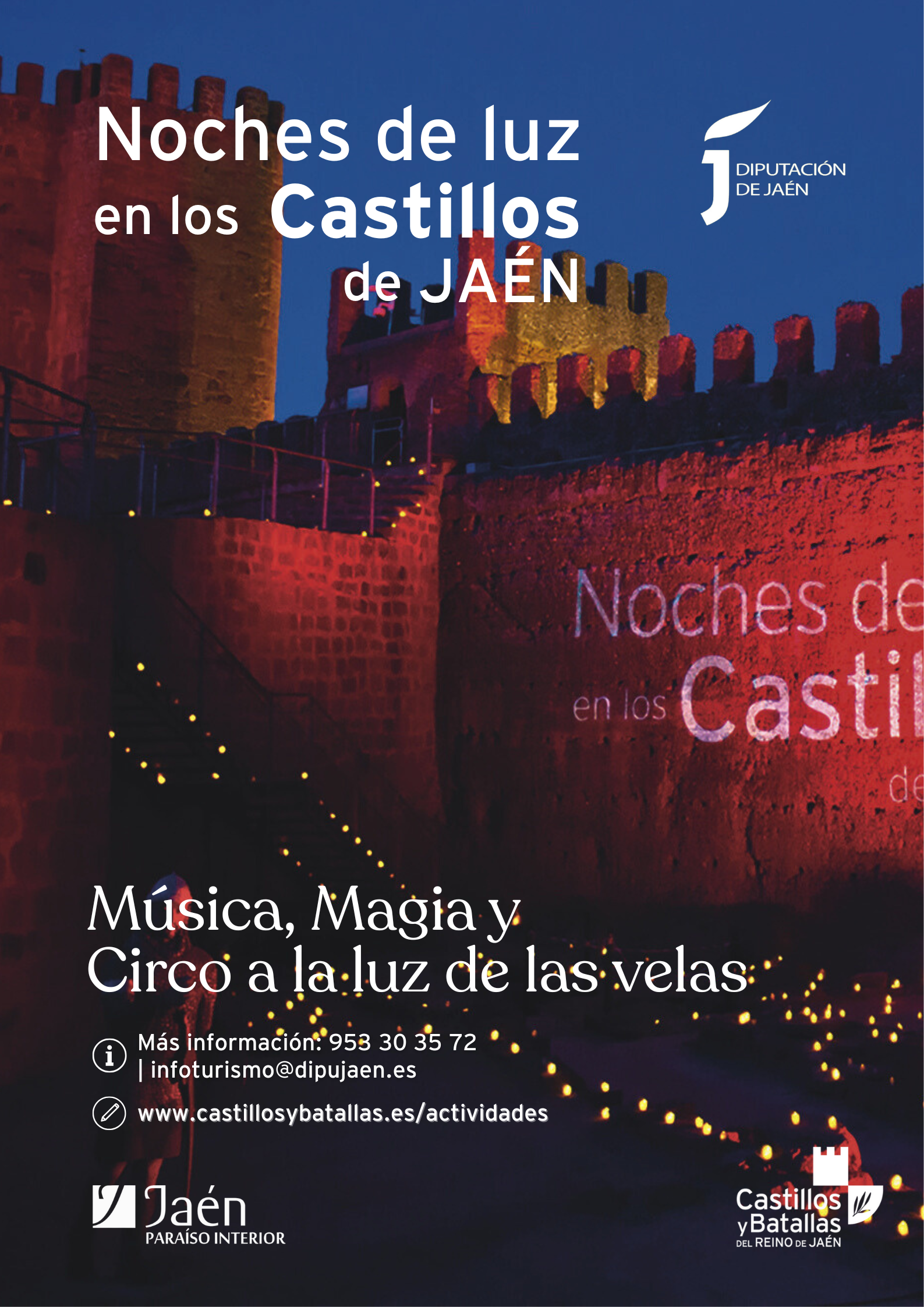 "Noches de Luz en los Castillos de Jaén 2025" continúa durante todo el mes de agosto con una agenda llena de actividades. Esta iniciativa, impulsada Diputación Provincial de Jaén con la colaboración de los municipios que integran la ruta “Castillos y Batallas del Reino de Jaén”, ofrece una variada programación nocturna para disfrutar durante el verano gratuitamente de veinte enclaves privilegiados de la arquitectura defensiva de la provincia.