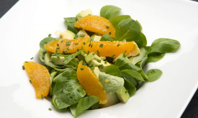 Una lechuga grande, lavada, escurrida, seca y troceada pequeña, 1 manojo de berros, lavados, escurridos, secos y cortaditos, ¼ de taza de cebollinos frescos cortaditos, 1/3 de una taza de hojas de eneldo fresco picado, 1 cucharadita de cáscara de naranja rallada, 1 cucharada de miel de flor de limón, 1/3 de taza de zumo de naranja recién exprimido, 2/3 de taza de aceite de oliva virgen extra, sal, pimienta negra molida