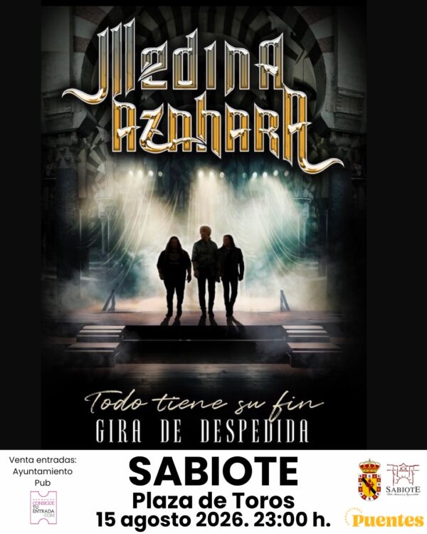 La mítica banda cordobesa Medina Azahara llega a Sabiote con su gira de despedida Todo tiene su fin, un recorrido emocional por más de cuatro décadas de rock andaluz que han marcado a varias generaciones. El concierto, que tendrá lugar el 15 de agosto a las 23:00 en la Plaza de Toros, será una oportunidad única para disfrutar de sus grandes himnos en un formato vibrante y lleno de energía.