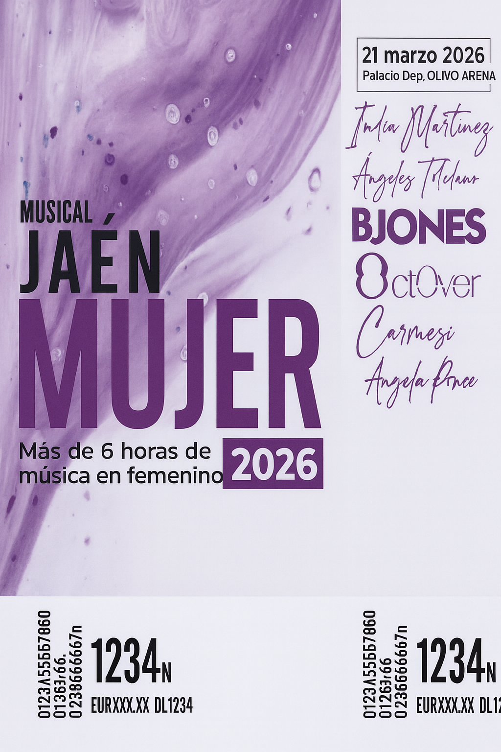 El Palacio de Deportes Olivo Arena de Jaén presenta más de seis horas de música en femenino. Por el escenario del Olivo Arena pasarán India Martínez, Ángeles Toledano, BJones, Carmesí y October. Maestra de ceremonia: Ángela Ponce.