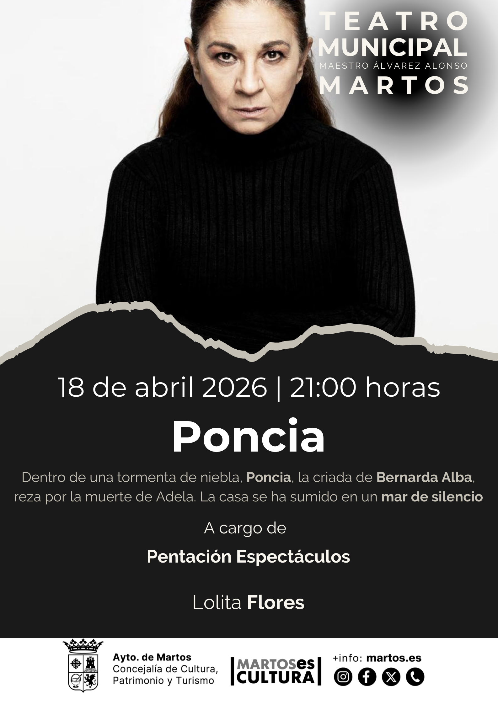 El 18 de abril llega a Martos la obra Poncia, interpretada por Lolita Flores, una pieza teatral que parte del universo de La casa de Bernarda Alba para dar voz propia a uno de sus personajes más potentes. La historia se sitúa después de la muerte de Adela, abriendo un espacio imaginario donde Poncia, liberada de silencios y jerarquías, puede por fin hablar sin miedo ni límites. Su lenguaje se desata en un tiempo y un lugar que antes le estaban prohibidos, y desde ahí ajusta cuentas con quienes permanecen en la casa.