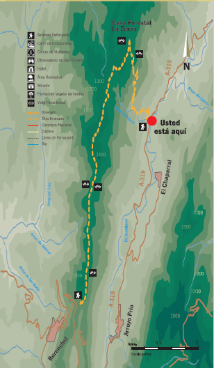 El sendero transcurre en primer lugar por la cresta montañosa que nos permite observar por un lado la zona preparque con olivares y al fondo la Loma y al otro lado el Valle del Guadalquivir en el interior del Parque Natural, siguiendo la pista llegaremos a la Casa Forestal Fuente de La Zarza. Aquí disfrutaremos de una vista panorámica del valle y de varias cumbres (El Yelmo, Banderillas y Cabeza del Tejo). A continuación descendemos por una senda de elevada pendiente, antiguo camino de herradura, que pasa junto al Barranco de la Tuerta, Arroyo del Sauco y los Huertezuelos para terminar en la carretera A-319.