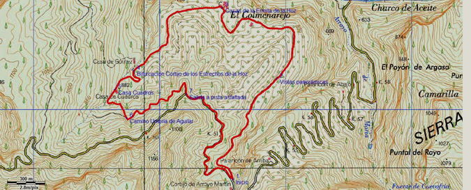 Más adelante y tras hacer la ruta dos curvas muy pronunciadas, primero hacia la izquierda y seguidamente hacia la derecha y continuando en ascenso, dejamos a la izquierda de la pista la Casa Cuadros, que se encuentra rodeada de centenarias encinas. Nos encontramos a 3,8 km del inicio. Pasando el cortijo hay una bifurcación de caminos, seguiremos el de la derecha de forma ascendente y realizando zigzag en la ladera de la Umbría del Aguilar. Pasaremos por una curva a la izquierda muy frondosa de vegetación por la que pasa un pequeño arroyo y más arriba desembocamos, a 4,1 km, en un camino que viene desde la derecha, al que nos incorporamos, para continuarlo hacia la izquierda. Este nos llevará hasta la pista asfaltada en la que iniciamos la ruta.
