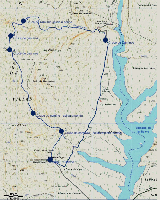 A unos cinco minutos encontramos las ruinas de la Casa Forestal de los Prados de Arredondo. Pasando el edificio, la senda de divide; continuamos por la derecha, tal y como nos indica la baliza. Medio kilómetro más adelante llegamos al arroyo Guazalamanco, justo donde finaliza la Cerrada de Navas. En este lugar, si nos desviamos siguiendo el cauce hacia arriba, llegamos a un rincón delicioso, ideal para tomarnos un agradable descanso. Tras el refresco, continuamos por la pista forestal, que encontramos al cruzar la corriente y, a la altura del km 6 de nuestro itinerario, la dejamos para seguir, a la derecha, una vereda que comunica con una senda que desciende por la ladera. A 800 metros nos encontramos de nuevo el arroyo, que vadeamos dos veces antes de llegar a la Cascada del Dique. A partir de aquí discurrimos por la pista forestal que desciende a la par del cauce, hasta que este se separa del mismo. 200 metros más adelante daremos vista al embalse de la Bolera.