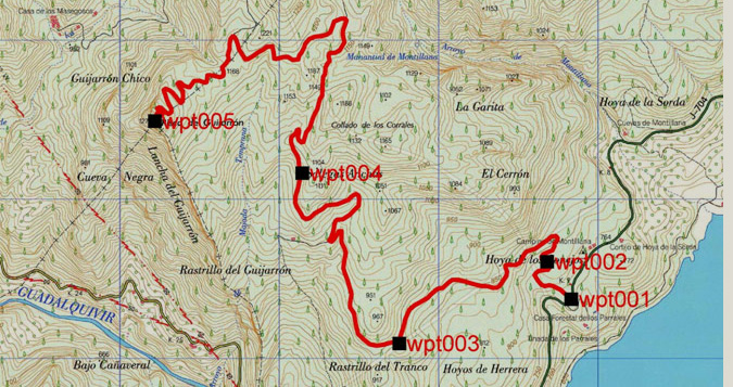 El recorrido discurre por una pista forestal habitualmente cerrada al tráfico de vehículos, que asciende serpenteando por las faldas del Guijarrón, objetivo final del recorrido. Tiene tramos muy panorámicos, con inmejorables vistas del embalse del Tranco, inicialmente de la cola de Hornos y posteriormente de su zona más central.