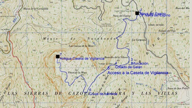 Las navas son terrenos muy fértiles que se sitúan a cierta altura que han sido aprovechados por el hombre desde tiempos inmemoriales como pastos frescos o como terrenos agrícolas; en la primera de ellas que encontramos en la Pista asfaltada primero y luego de tierra JF-7091, la Nava del Espino, se sitúa el inicio de este sendero, justo al lado de las ruinas de la casa forestal del mismo nombre.