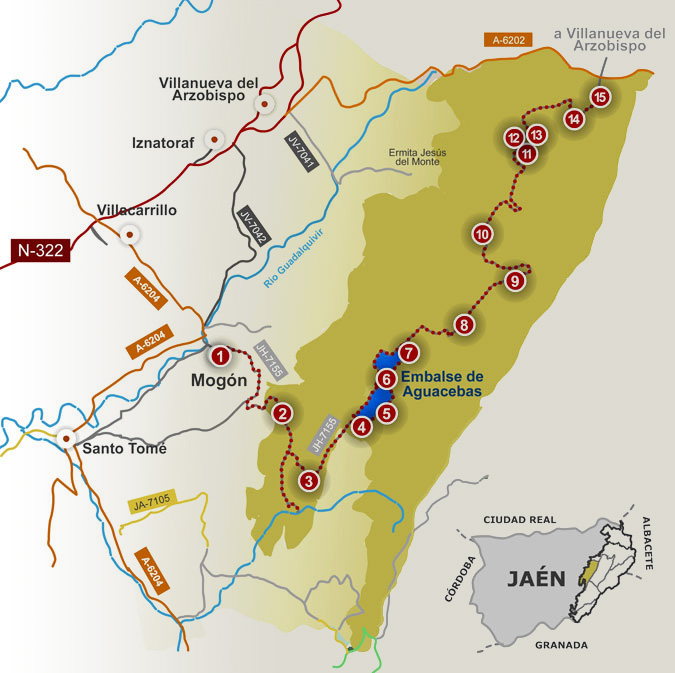 1. Km 0. Mogón. Esta bella población perteneciente al municipio de Villacarrillo se halla en el valle del Guadalquivir. Sus tierras de olivos y fértiles vegas son también bañadas por el río Aguascebas, ya que en este punto confluyen ambos cauces. Dispone de una gran zona para el baño, muy bien equipada en el paraje de “El Molinillo”.