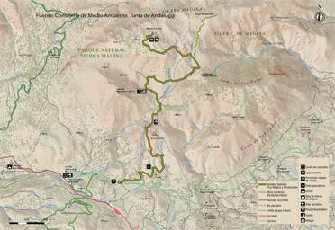 Al principio del sendero, en una curva hay un desvío que se dirige al barranco del Gargantón, que no tomaremos. Nuestro camino es siempre ascendente, por una pista amplia y con firme de tierra. Zigzageando gana altura durante cuatro kilómetros, mientras atraviesa un denso pinar de repoblación. Esta primera etapa de aproximación nos empieza a mostrar vistas, y nos lleva al interior de Sierra Mágina.