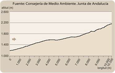 Unos cientos de metros más arriba de la tinada la pista se acaba y comienza la senda, que asciende en dirección este, y que está suficientemente marcada para seguirla sin dificultad. Solo en condiciones de fuertes nevadas puede perderse la marca de la senda. El Barranco de las Covatillas, primer tramo de senda, nos lleva hasta el Puerto de Bolos, que se asoma a la vertiente este, hacia el Barranco del Gargantón y más allá el Valle del Jandulilla. En este punto el sendero gira a la izquierda enfrentando dirección norte, hacia la zona de cumbres.