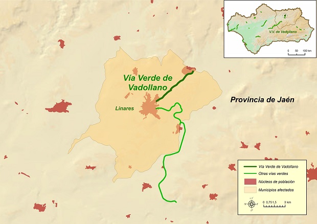 La Vía Verde de Vadollano discurre por el antiguo trazado de la vía de ferrocarril Linares-Vadollano, desde la antigua factoría de Santana hasta las puertas de acceso del Cuartel del Destacamento del Ejército ubicado en Vadollano, a partir del cual pueden observarse restos de raíl y traviesas, que con el paso de los años han quedado cubiertas de vegetación y son prácticamente intransitables.