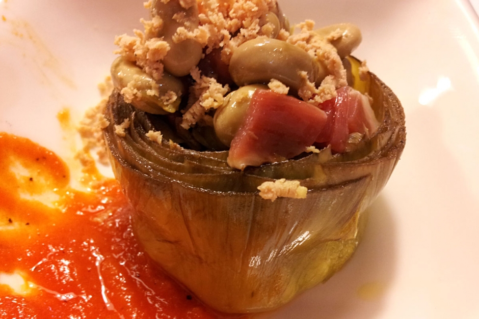 Corazón de alcachofa confitada en aove, rellena de habitas y foie